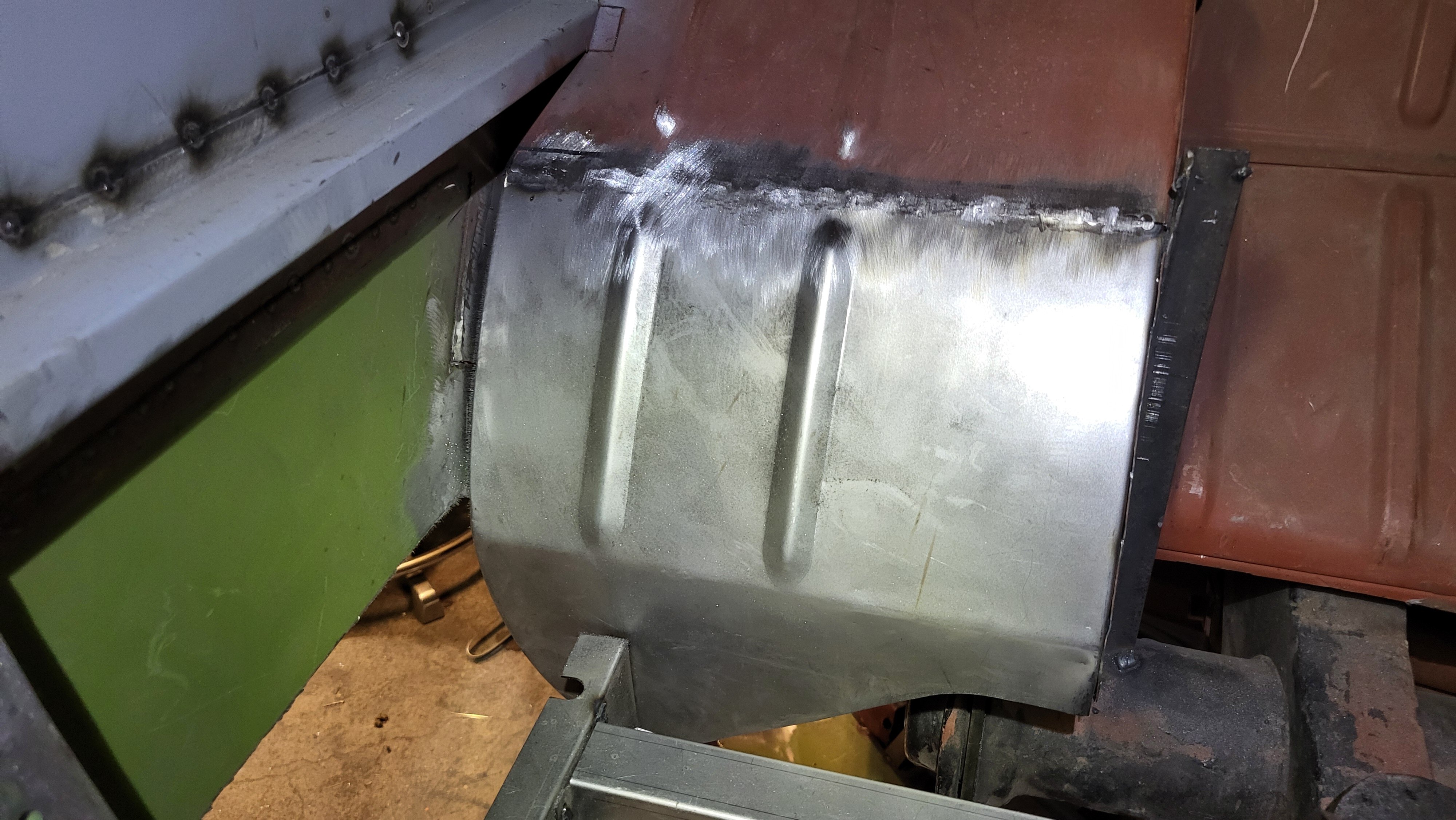 22. Noniin.... tänään menikin sitten vähän enemmän palasiksi, sellaistakin jota ajattelin ettei ei tarvitsisi koskea. Homma alkoi korjauksen poistolla jonka teosta olin jopa ulkopuoliselle maksanut. Takasisälokarin etureuna sai siis kyytiä. Sieltä sitten tulikin esille enemmän huippukorjausta, tuo helman liitos olisi saattanut lähteä vähän mätänemään jos tuon sinne olisi jättänyt. Ratkaisuna vedin päällekkäin vedetyn pellin lokarin sisältä poikki koska tämä paikka ei taasen olisi istunut uuden korjauspalan kanssa koska ei ole tasainen. Ulkoapäin nämä on kaikki tinattu ja ummessa mutta sisältä auki. Eli tämä tulee hitsattua uusiksi puskusaumalla. Korjauspalassakin vähän kantti liian loiva eli tälle pitää näyttää vähän kanttia ja kutistajaa. Seuraavaksi sitten tarvitsinkin mittoja mihin sivuhelman sisäosa asettuu että saan lokarin korjauspalan kohdalleen. Ja tämän varmasti oikeaan paikkaan saaminen tarkoitti sivuhelman sovitusta ja jotta sivuhelman sai sovitettua tuli todettua että c-pilarin alaosa on 5mm liian alhaalla eli se piti katkaista. Ja jotta tähän pääsi käsiksi tuli alahelma parioven takaa ottaa irti ja tietty sekin oli liian alhaalla ja ei sopinut helman kanssa niin tässä sitä sit ollaan. Sentään talli-ilta ei ihan täysin pilkkomiseksi mennyt helman sisäosan sain hitsattua paikalleen.