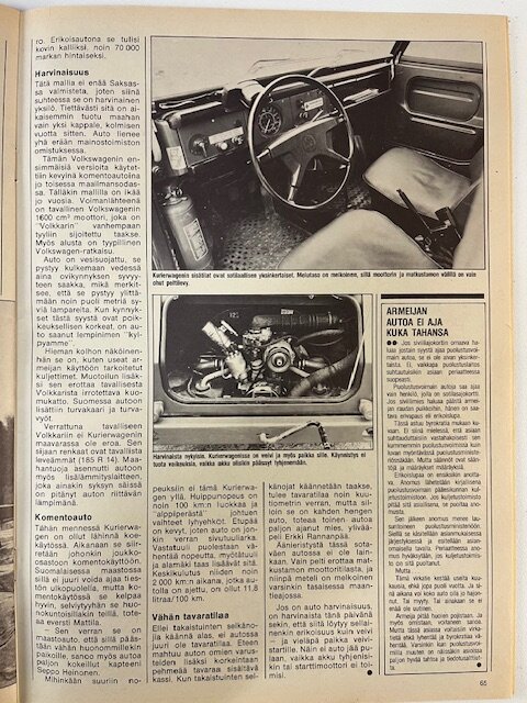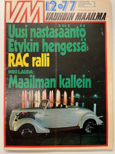 Tosiaan usean kuukauden etsinnän jälkeen internetin ihmeellisessä maailmassa (aina välillä kun asia tuli mieleen) lähinnä facebookissa aikamoisella salapoliisityöllä sain vainua että se olisi Vauhdin Maailma 12/-77 Satuin löytämään sen lehden huuto.netistä ja eikun ostamaan ja toivomaan että osui oikein, ja niin se osui Tästä selviää: -artikkelin auto on lahjoitettu Wihurin toimesta SA:lle elokuussa -77 ja on valmistettu Meksikossa -artikkelissa lukee että tiettävästi tuotu aiemmin ainoastaan 1 kpl kolmisen vuotta sitten, auto lienee yhden mainostoimiston omistuksessa joka se on pakko olla minun auto ja asiaa vahvistaa se että autoni kyljessä näkyy teipin jäljet MAINOSTOIMISTO VIISARI OY ROVANIEMI Eli kaiken järjen mukaan näitä on tullut Wihurin kautta 2 kpl, yksi -74 joka on minun ja yksi -77 joka on lahjoitettu SA:lle Miksi minun on ylipäätänsä tuotu olisi kiva tietää, todennäköisesti esittelykäyttöön ja on todennäköisesti käynyt testikäytössä SA:lla kun se on tilattu NATO mallisena eikä siviili mallisena, vielä lisävarusteena lukkoperä Esittelykäyttöä puoltaa myös se kun se on rekisteröity vasta vuoden ikäisenä joulukuussa -74, auto on valmistettu joulukuussa -73 ja toimitettu heti suomeen joten se on tullut suomeen vuodenvaihteessa -73/-74