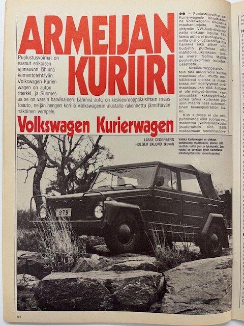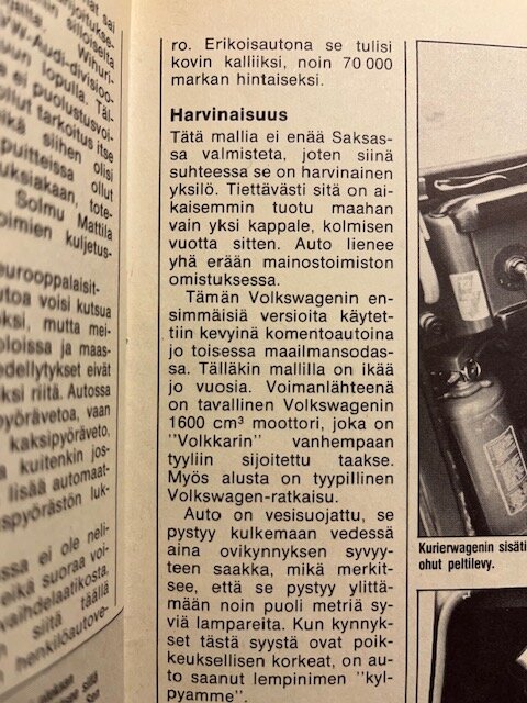 Jo silloin kun omistin enismmäisen 181sen yli 10 vuotta sitten kiinnosti 181sen historia suomessa, useasta paikasta olen kuullut että niitä olisi muutama kappale uutena tullut suomeen, lähinnä kait testikäyttöön VW yritti myydä niitä SA:lle joka ei kiinnostunut, taisi olla nelivedon puute ja hinta esteenä kun suomeen tuli vaikka kuinka paljon nelivetoisia UAZeja idästä ja ilmeisen edullisesti Ennen kun ostin tämän auton olin törmännyt tähän kuvaan facebookissa joka on leikattu (kuvattu) jostain suomlaisesta autolehdestä, en vaan hiennyt mistä lehdestä ja milloin, tämä kuitenkin vahvisti että aihetta on käsitelty jossain suomalaisessa autolehdessä Kuvasta näkyy sen lisäks iettä on military malli: -auto on uudemmilla etulookareilla jossa isompi vilkun paikka jotka tuli joskus noin -72 / -73 (tuli todennäköisesti USA vilkkuja varten) -14" vanteet jotka tuli tietääkseni 3/-73 kun tuli IRS takajousitus -ilmeisesti tuo "military" kuvio renkaissa kuten minun autossa -autossa SA tunnus 979 -kuvan auto on viimeistä sukupolvea 181stä kun minunkin auto