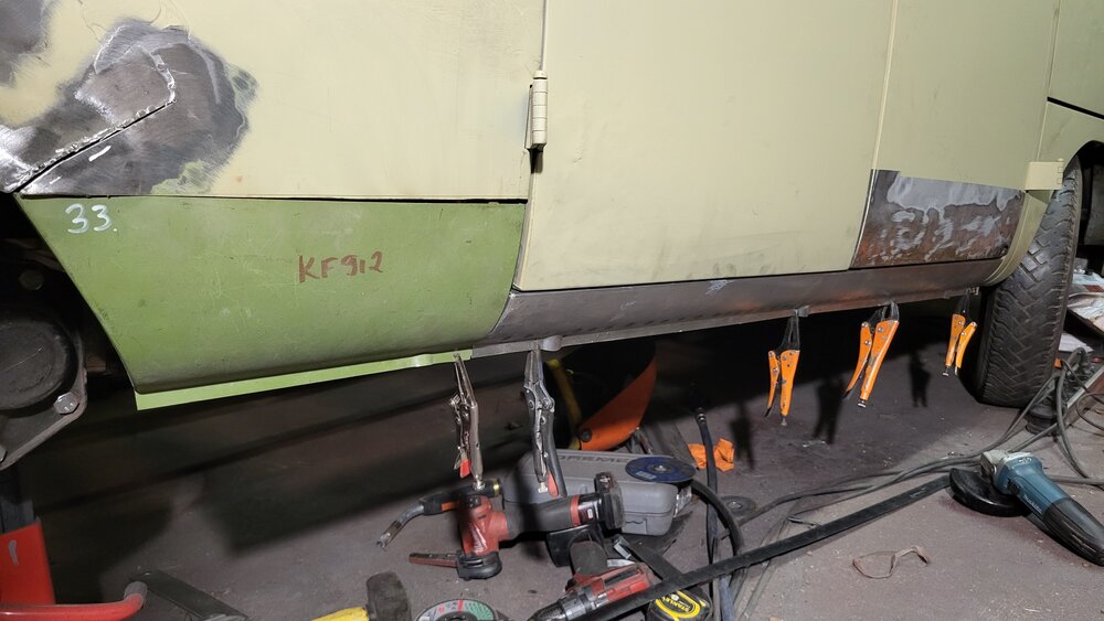3. Noniin.... tänään menikin sitten vähän enemmän palasiksi, sellaistakin jota ajattelin ettei ei tarvitsisi koskea. Homma alkoi korjauksen poistolla jonka teosta olin jopa ulkopuoliselle maksanut. Takahelman sisäosa sai siis kyytiä. sieltä sitten tulikin esille enemmän huippukorjausta tuo helman liitos olisi saattanut lähteä vähän mätänemään jos tuon sinne olisi jättänyt. Ratkaisuna vedin päällekkäin vedetyn pellin lokarin sisältä poikki koska tämä paikka ei taasen olisi istunut uuden korjauspalan kanssa koska ei ole tasainen. Ulkoapäin nämä on kaikki tinattu ja ummessa mutta sisältä auki. Korjauspalassakin vähän kantti liian loiva eli tälle pitää näyttää vähän kanttia ja kutistajaa. Seuraavaksi sitten tarvitsinkin mittoja mihin sivuhelman sisäosa osattuu että saan lokarin korjauspalan kohdalleen. Ja tämän varmasti oikeaan paikkaan saaminen tarkoitti sivuhelman sovitusta ja jotta sivuhelman sai sovitettua tuli todettua että c-pilarin alaosa on 5mm liian alhaalla eli se piti katkaista. Ja jotta tähän pääsi käsiksi tuli alahelma parioven takaa ottaa irti ja tietty sekin oli liian alhaalla ja ei sopinut helman kanssa niin tässä sitä sit ollaan. Sentään talli-ilta ei ihan täysin pilkkomiseksi mennyt helman sisäosan sain hitsattua paikalleen.