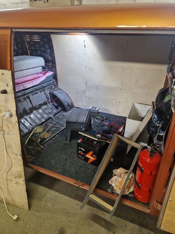 5. Jatketaas vielä, että saadaan nykyaika jossain vaiheessa kiinni.. Kesä -24 meni siis Norja-Tanska-Ruotsi reissun merkeissä, missään pidemmällä ei tullut käytyä. Ja kun tekniikka tuntui toimivan moitteetta niin sille ei ollut isompia suunnitelmia seuraavaksi talveksi. Talvi 2024-25 menikin vain joidenkin kosmeettisten parannusten merkeissä. MadMatzilta tuli tilattua ohjaamoon ja moottoritilan päälle matot. Istuvuus oli vähän mitä oli, mutta ainakin melutaso hiljeni aika paljon. lokasuojien päälle liimasin STP goldin bitumit ja lattiamaton alle tuli äänieristehuopa, sekin MadMatziltä. Bitumeihin sitten matot kontaktiliimalla kiinni. Tuhkakuppiin tekaisin pari USB-pistoketta puhelimen latausta varten. Takalasin tiiviste oli hieman aikaa nähnyt, niin siihen valmiina oleva uusi tiiviste tuli vaihdettua paikalleen. Iloinen yllätys oli likimain uuden veroinen ikkunan karmi hieman patinoituneessa luukussa, ja se ei tarvinnut kuin puhdistuksen uutta lasia varten. Ehkä suurin päivitys tuli hupiakkupuolelle, jossa luovuttiin vanhasta 100Ah AGM akusta ja tilalle tuli modernimpaa LiFePo4 sähköä. 230v sähkön syöttö Defan pienellä pistokkeella, jonka perässä siätilan lämmittimelle tarkoitettu pistorasia. Siihen kiinni kotelo jossa kwh-mittari ja yhdistetty johdonsuoja/vikavirtasuoja, ja siitä sitten sähköä akkulaturille ja yhdelle pistorasialle autossa. Victronin latureita kovasti suositeltiin monessa paikassa, joten niillä mentiin. Auton laturin ja LiFePo4 akun väliin tuli 18A DC-DC laturi ja 230v laturiksi 15A malli. Akuksi valikoitui LiTime 100Ah akku, koko hieman 60Ah lyijyakkua korkeampi, mutta painoa n. puolet. Näillä eväillä siis kesään 2025, joka jäi reissujen osalta hieman vaatimattomaksi. Suomen ulkopuolella ei tullut käytyä, mutta jotain pieniä reissuja ajeltiin kotimaassa.