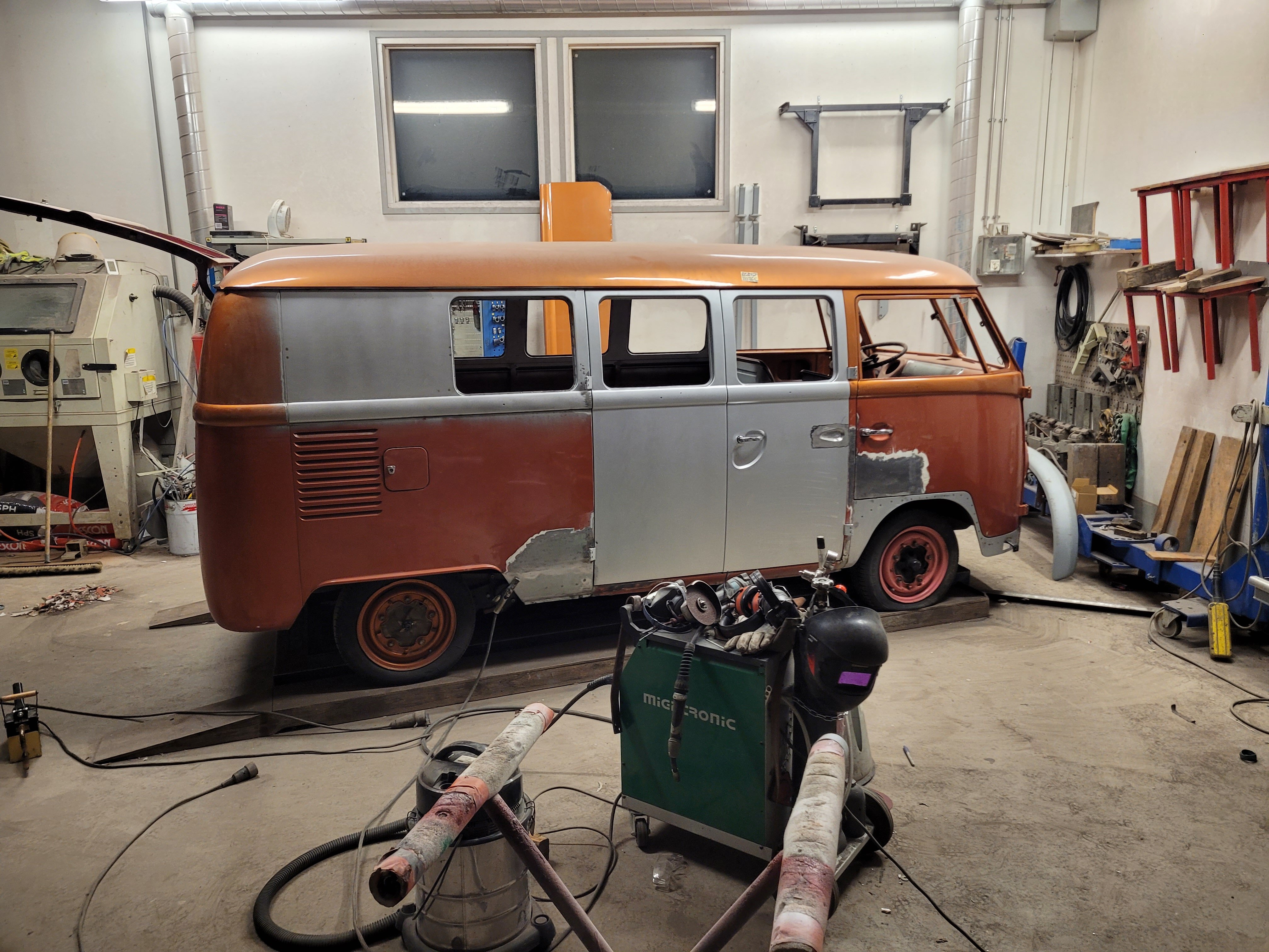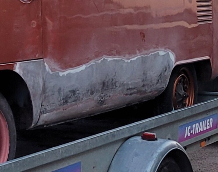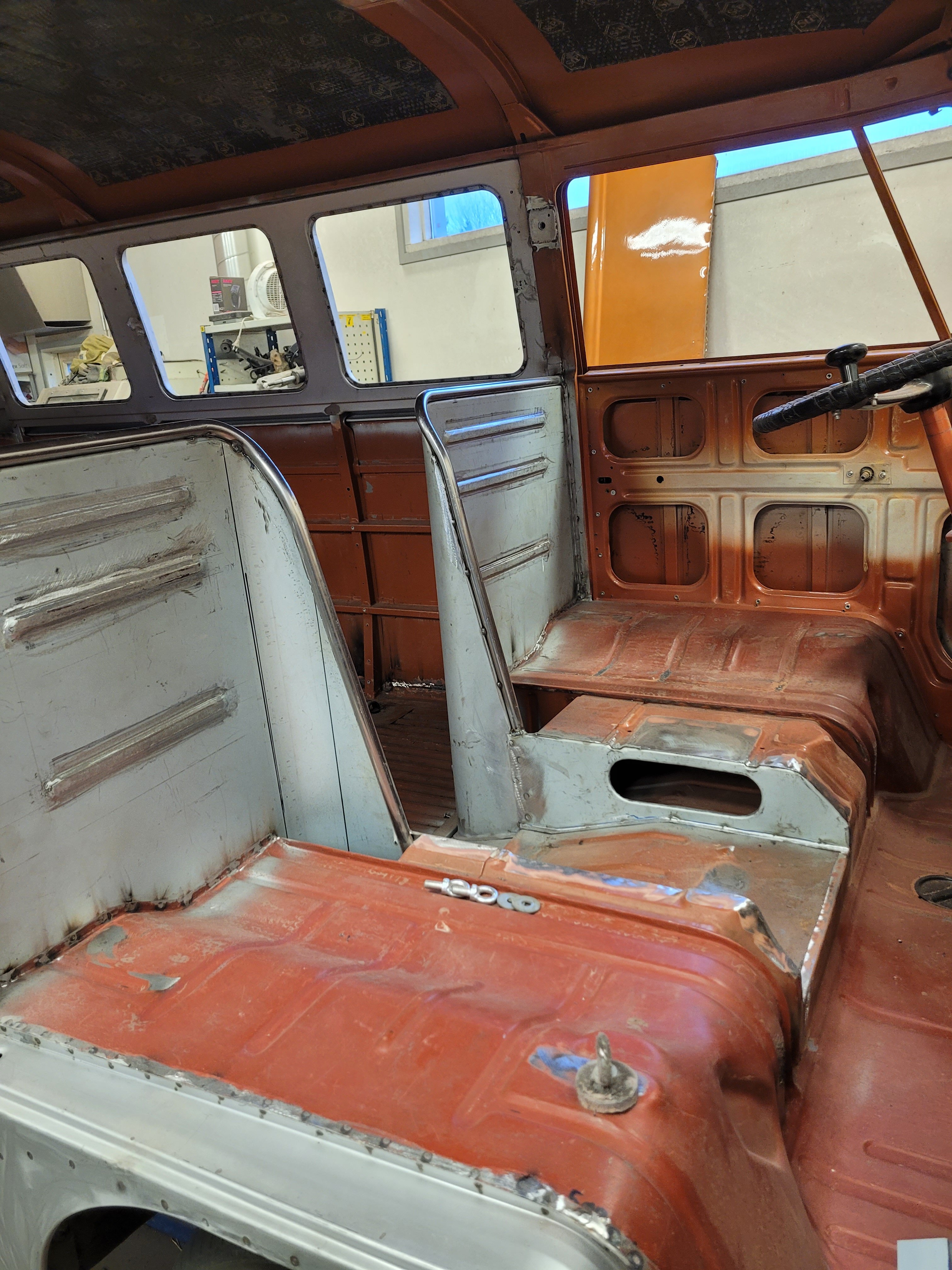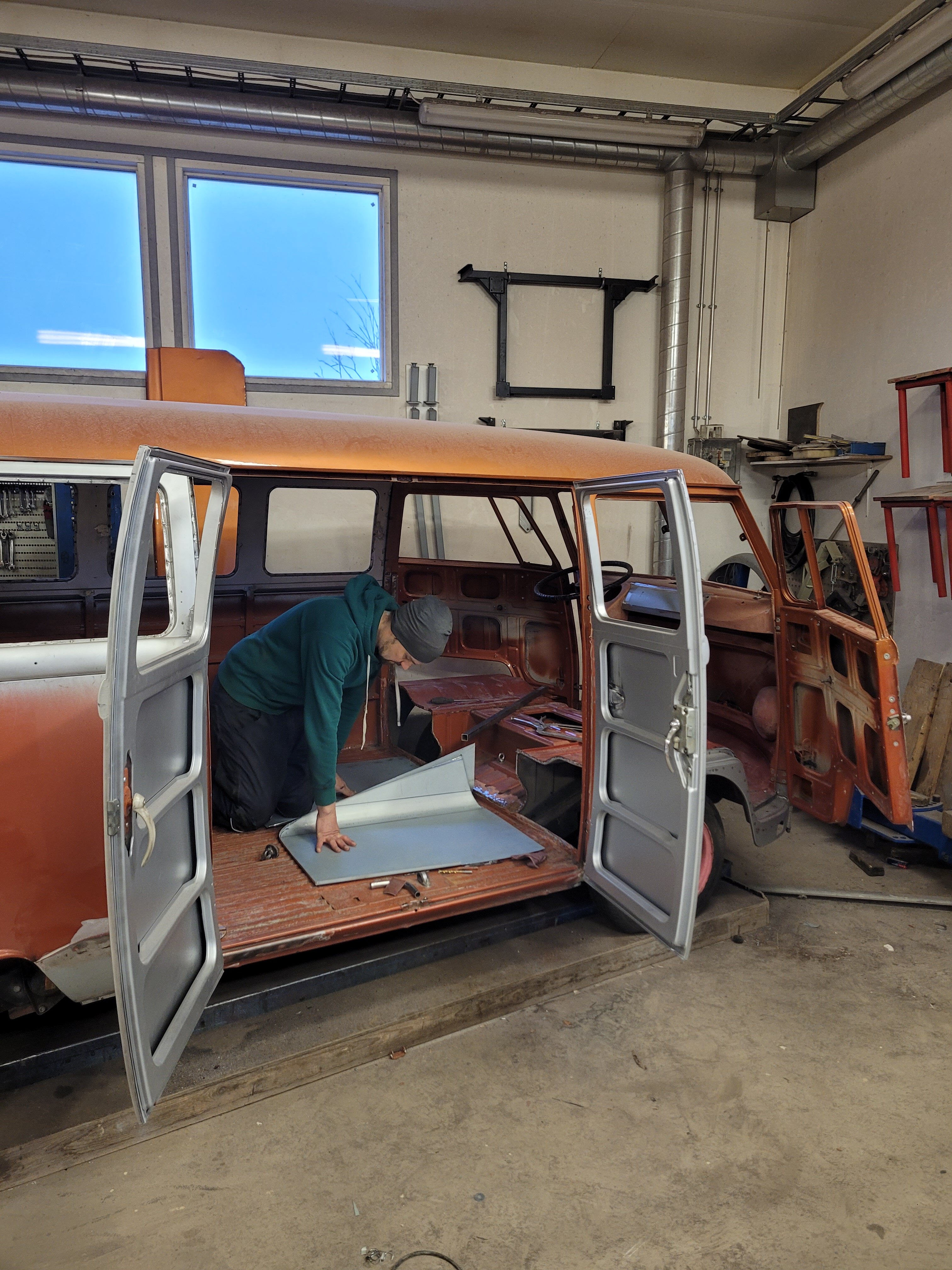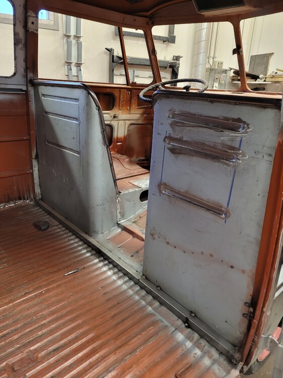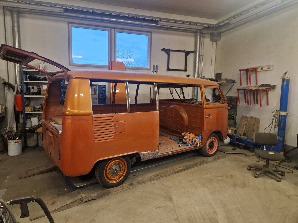 2. NONIIN, nyt on päästy jo tähän talveen ja miltei nykytilanteeseen. 2025 elokuussa käytiin ajelemassa saariston rengastie ja siitähän sitten tulikin KALLIS reissu. Hieman koleahkossa säässä istuttiin autossa leirintäalueella meren rannalla, jossa vaimo sitten tokaisi, että "Tähän pitää saada ikkunat". Vielä kun pari kanssa harrastajaa sai vaimon vakuutettua läpikäveltävän ohjaamon autuudesta, niin konkurssi häämötti nurkan takana. Itseä oli alkanut hieman nyppiä joka talvinen auton purkaminen ja auton keskeneräisyys, niin tämän talven ohjelmaan otettiin sitten laajemmat peltityöt ja auton maalaus (vihdoinkin, voisi joku todeta..). Tallikausi alkoi siis totuttuun tapaan purkamisella ja äänieristebitumien poistamisella, joita autossa olikin miltei joka paikassa. Helmojen korjauksen laatu jo arvaattiinkin aiemmin tehtyjen takanurkkien avauksen perusteella, mutta silti kitin määrä oli hieman yllätys. Korjauspellit oli lisäksi hitsattu päällekkäin vanhojen peltien kanssa, ja tasoitettu kitillä hitsisaumoja siistimättä. Ja tämä siis ihan maksettuna työnä aikoinaan teetetty. No, onpahan peltisepälle jotain tekemistä... Kone ja vaihdelaatikko irti, ja kun laatikko oli lattialla niin se oli näppärä lähettää tarkistettavaksi, eikä turhaan. Laatikkomies oli hieman jopa ihmeissään että vaihteistolla oli kuitenkin päästy eteenpäin. No, olihan se jo hieman pitänyt ääntä varsinkin moottorijarrutuksessa, mutta nyt on uudet rojut sisällä niin uskaltaa taas tulevaisuudessakin Suomen ulkopuolelle. Peltiosia oli hommattu BBT:ltä valmiiksi jo jonkinmoinen kasa, ja kun peltiseppä ilmoitti marraskuussa että nyt on pajalla juniksen mentävä aukko, niin suunta kohti Vaskiota. Sitten alkoikin tapahtua ns. isolla pensselillä ja reilut pari viikkoa auto vietti peltisepän hellässä huomassa. Vanhat kylkipalat pois, ja uudet korjauspalat paikalleen. Myös pariovet päädyttiin vaihtamaan kokonaan, eikä alettu rei'ittämään ehjiä umpparin ovia. Ei ne BBT:n peltiosatkaan suoraan istu, vaikka peltiseppä niitä ihan hyviksi kehuikin, mutta matimies on amatimies tässäkin asiassa, ja se on syy miksi en itse tee peltitöitä... Etummainen pariovi jouduttiin ottamaan pykälää vanhempi, kun uudempaa ei ollut saatavilla, joten siihen piti askarrella etuoven kahvaa varten kolo. Myös oikeanpuolen doglegi oli joskus korvattu brassi-doglegillä, ja mysötty paikoilleen ilmeisesti pajavasralla, niin myös se oli vaihtolistalla. Samassa kuvassa näkyy oven takakulma, jota oli joskus korjattu ja pintapelti oli kuopalla ja löysä, ja korjattu kitillä. Pelti oiottiin ja kiristettiin niin ehkä hieman vähemmän kittiä riittää. Sitten helmojen kimppuun.. Ensin kitit lattialle ja oikeanpuoleisen helmanpätkän peltiseppä päätyi vaihtamaan, mutta vasen oli sen verran tiukasti kiinni ja vain saumastaan huono, että siitä korjattiin vain liitoskohta. Ja sitten väliseinän kimppuun, jotta pääsee kulkemaan ohjaamosta suoraan jääkaapille, kulkematta lähtöruudun kautta.. Kuvassa näkyy myös ähtäröity kojelauta, kun en ole koskaan tuolle CD-levy telineelle juniksessa keksinyt mitään järkevää funkiota.. Syksyllä kun projektia aloiteltiin, niin ei ollut läpikäveltävän juniksen muutossarjoja saatavilla, mutta nythän niitäkin on jo valmiina setteinä. Peltiseppä haki peltiä ja putkea ja alkoi taikomaan niitä selkänojiksi. Jonkinmoisen ähräämisen jälkeen näyttivät ainakin minun silmään kelvollisilta. Selkänojat on tehty alkuperäisillä mitoilla ja alkuperäisen mallin mukaan, mutta ei ihan alkuperäisiksi kuitenkaan. Mm. säilytyslokeroihin on pääsy koteloiden sivuista, eikä yläpuolelta penkin alata kuten alkuperäisissä.