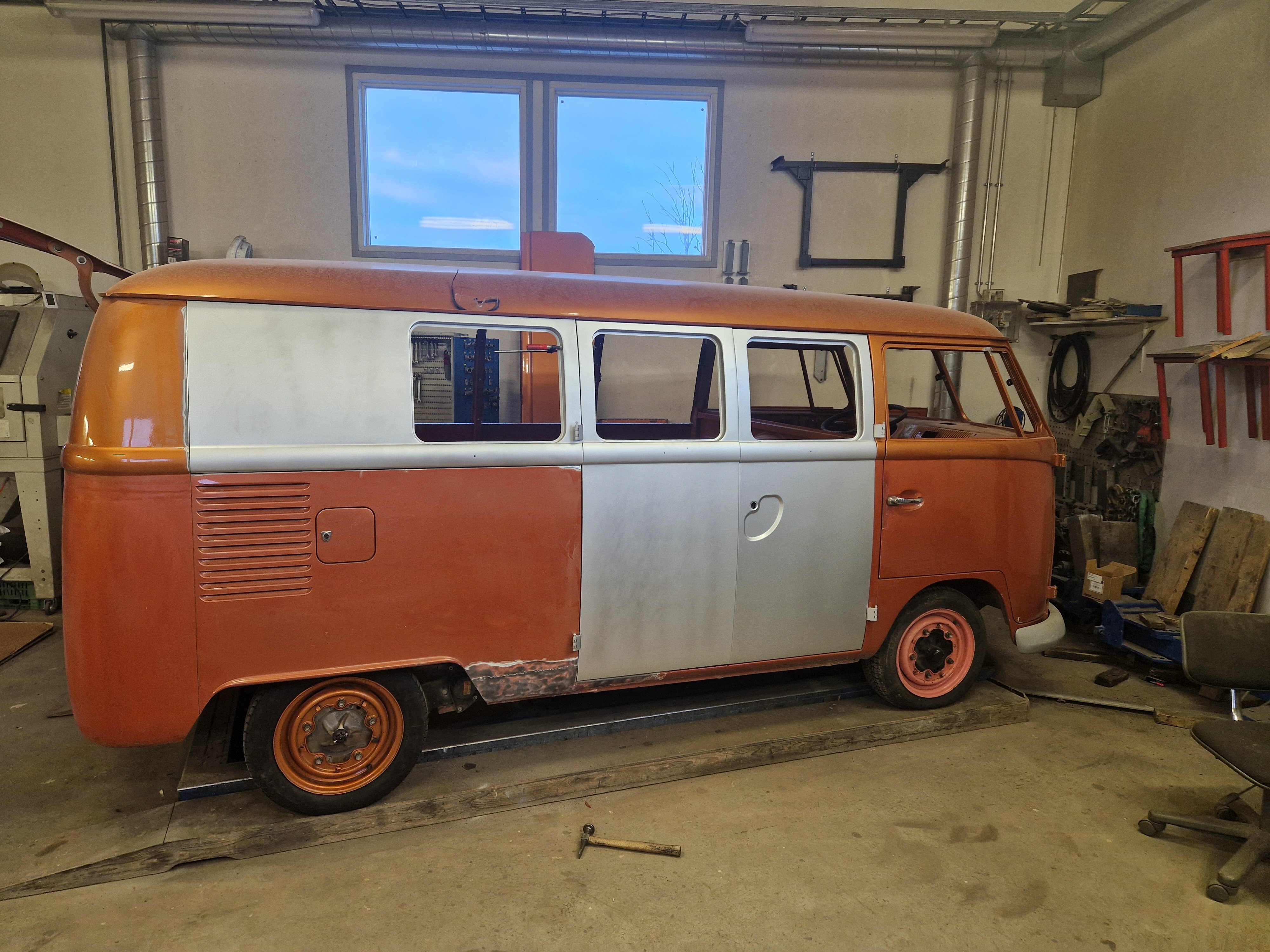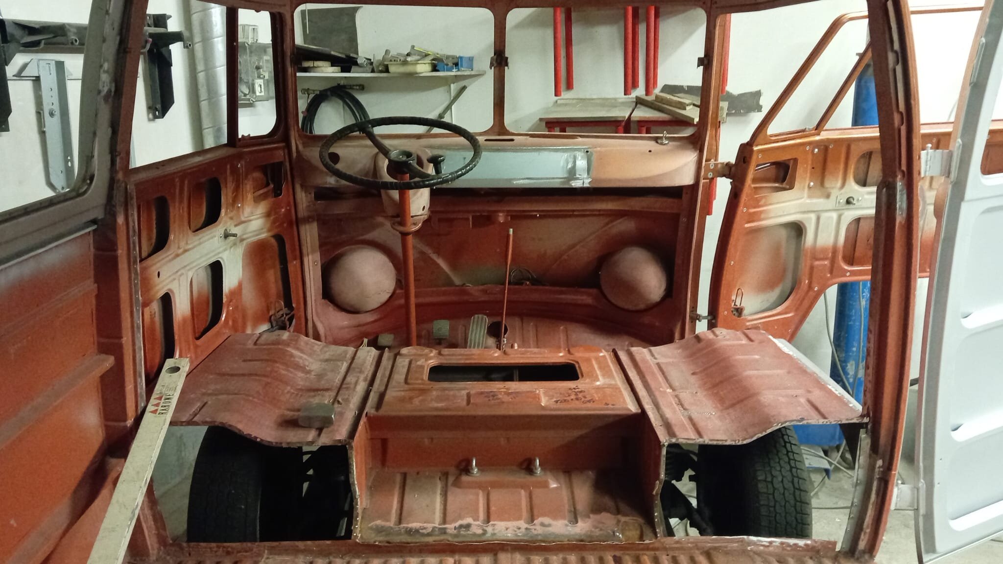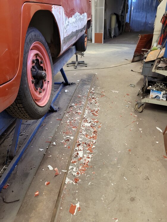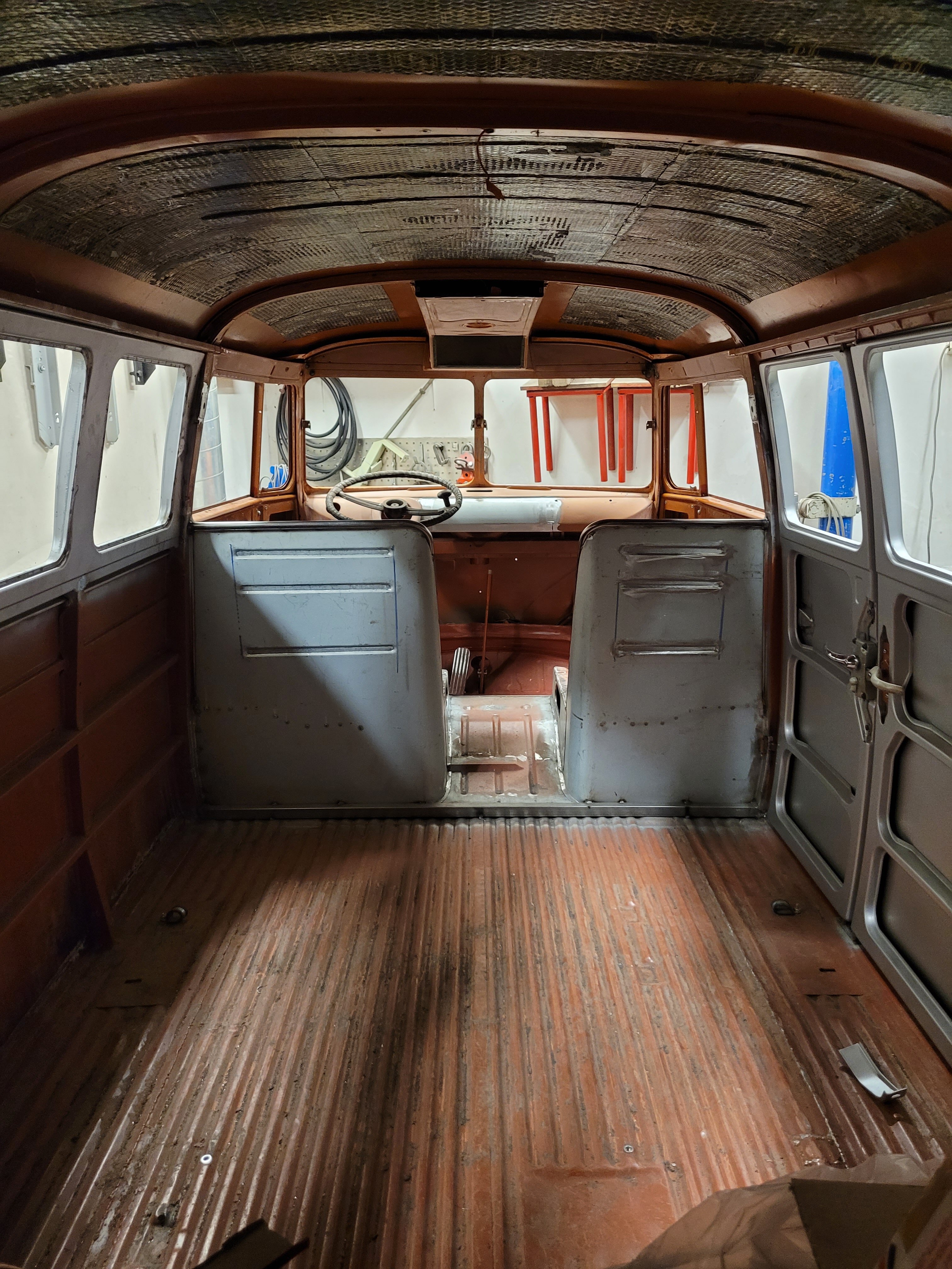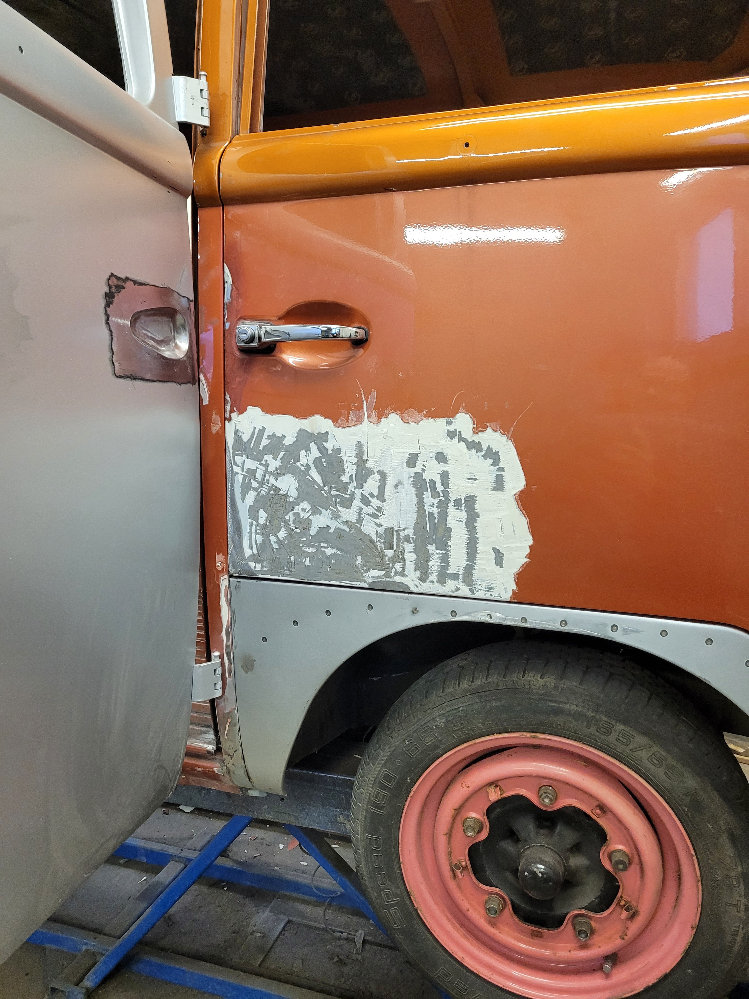 2. NONIIN, nyt on päästy jo tähän talveen ja miltei nykytilanteeseen. 2025 elokuussa käytiin ajelemassa saariston rengastie ja siitähän sitten tulikin KALLIS reissu. Hieman koleahkossa säässä istuttiin autossa leirintäalueella meren rannalla, jossa vaimo sitten tokaisi, että "Tähän pitää saada ikkunat". Vielä kun pari kanssa harrastajaa sai vaimon vakuutettua läpikäveltävän ohjaamon autuudesta, niin konkurssi häämötti nurkan takana. Itseä oli alkanut hieman nyppiä joka talvinen auton purkaminen ja auton keskeneräisyys, niin tämän talven ohjelmaan otettiin sitten laajemmat peltityöt ja auton maalaus (vihdoinkin, voisi joku todeta..). Tallikausi alkoi siis totuttuun tapaan purkamisella ja äänieristebitumien poistamisella, joita autossa olikin miltei joka paikassa. Helmojen korjauksen laatu jo arvaattiinkin aiemmin tehtyjen takanurkkien avauksen perusteella, mutta silti kitin määrä oli hieman yllätys. Korjauspellit oli lisäksi hitsattu päällekkäin vanhojen peltien kanssa, ja tasoitettu kitillä hitsisaumoja siistimättä. Ja tämä siis ihan maksettuna työnä aikoinaan teetetty. No, onpahan peltisepälle jotain tekemistä... Kone ja vaihdelaatikko irti, ja kun laatikko oli lattialla niin se oli näppärä lähettää tarkistettavaksi, eikä turhaan. Laatikkomies oli hieman jopa ihmeissään että vaihteistolla oli kuitenkin päästy eteenpäin. No, olihan se jo hieman pitänyt ääntä varsinkin moottorijarrutuksessa, mutta nyt on uudet rojut sisällä niin uskaltaa taas tulevaisuudessakin Suomen ulkopuolelle. Peltiosia oli hommattu BBT:ltä valmiiksi jo jonkinmoinen kasa, ja kun peltiseppä ilmoitti marraskuussa että nyt on pajalla juniksen mentävä aukko, niin suunta kohti Vaskiota. Sitten alkoikin tapahtua ns. isolla pensselillä ja reilut pari viikkoa auto vietti peltisepän hellässä huomassa. Vanhat kylkipalat pois, ja uudet korjauspalat paikalleen. Myös pariovet päädyttiin vaihtamaan kokonaan, eikä alettu rei'ittämään ehjiä umpparin ovia. Ei ne BBT:n peltiosatkaan suoraan istu, vaikka peltiseppä niitä ihan hyviksi kehuikin, mutta matimies on amatimies tässäkin asiassa, ja se on syy miksi en itse tee peltitöitä... Etummainen pariovi jouduttiin ottamaan pykälää vanhempi, kun uudempaa ei ollut saatavilla, joten siihen piti askarrella etuoven kahvaa varten kolo. Myös oikeanpuolen doglegi oli joskus korvattu brassi-doglegillä, ja mysötty paikoilleen ilmeisesti pajavasralla, niin myös se oli vaihtolistalla. Samassa kuvassa näkyy oven takakulma, jota oli joskus korjattu ja pintapelti oli kuopalla ja löysä, ja korjattu kitillä. Pelti oiottiin ja kiristettiin niin ehkä hieman vähemmän kittiä riittää. Sitten helmojen kimppuun.. Ensin kitit lattialle ja oikeanpuoleisen helmanpätkän peltiseppä päätyi vaihtamaan, mutta vasen oli sen verran tiukasti kiinni ja vain saumastaan huono, että siitä korjattiin vain liitoskohta. Ja sitten väliseinän kimppuun, jotta pääsee kulkemaan ohjaamosta suoraan jääkaapille, kulkematta lähtöruudun kautta.. Kuvassa näkyy myös ähtäröity kojelauta, kun en ole koskaan tuolle CD-levy telineelle juniksessa keksinyt mitään järkevää funkiota.. Syksyllä kun projektia aloiteltiin, niin ei ollut läpikäveltävän juniksen muutossarjoja saatavilla, mutta nythän niitäkin on jo valmiina setteinä. Peltiseppä haki peltiä ja putkea ja alkoi taikomaan niitä selkänojiksi. Jonkinmoisen ähräämisen jälkeen näyttivät ainakin minun silmään kelvollisilta. Selkänojat on tehty alkuperäisillä mitoilla ja alkuperäisen mallin mukaan, mutta ei ihan alkuperäisiksi kuitenkaan. Mm. säilytyslokeroihin on pääsy koteloiden sivuista, eikä yläpuolelta penkin alata kuten alkuperäisissä.