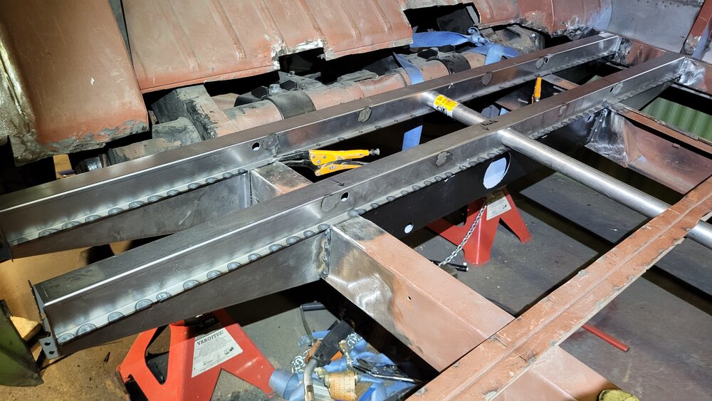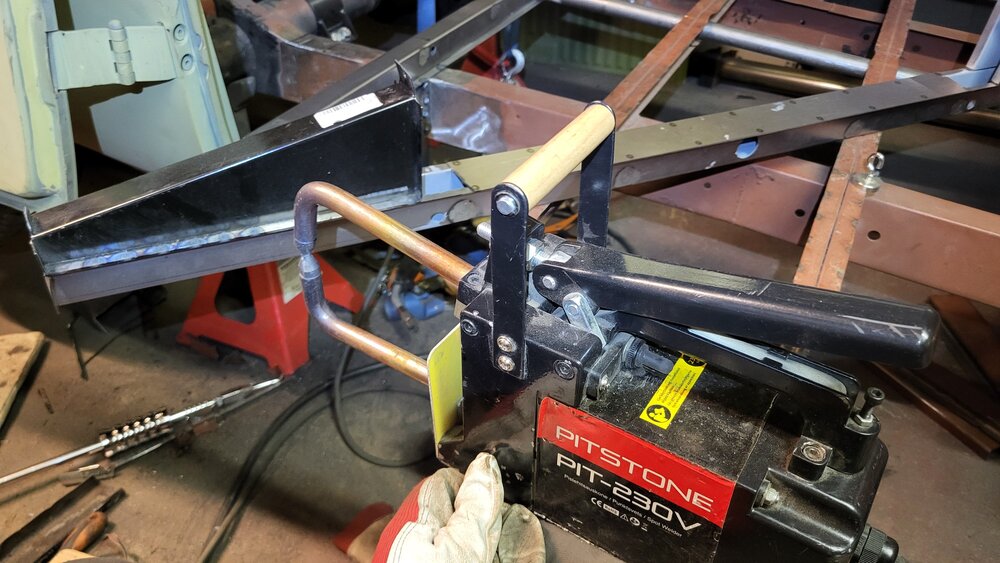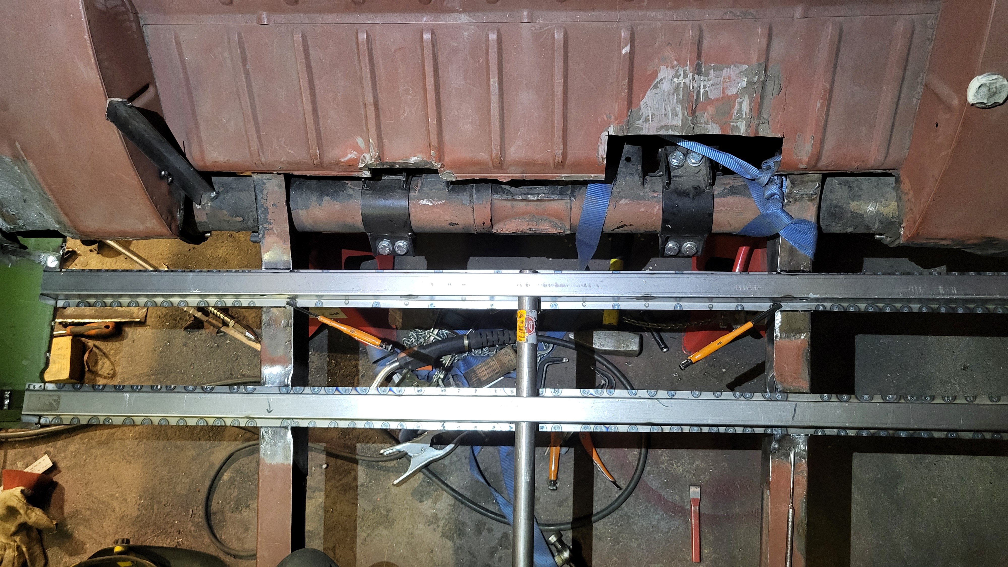 Kun mietin tätä kasaamisjärjestystä ja puuilon pistehitsin rajoitteita niin tajusin että keskipalkkin keski/ alaosa kannattaa laittaa kiinni ennen takapalkin paikalleen laittoa. Eli keskiosa preppaukseen ja maalia sisään, reikien poraus ja palkki paikalleen. Tässä siis tuo puuilon härveli, vaikka onkin painava ja hankala käyttää ja ilman ajastinta niin näiden palkkien hitsaus tulppahitsien kanssa olisi ollut kaikkien reikien poraamisten, hitsaamisen ja hiomisen kanssa aivan tuhottomasti isompi urakka. Takimmaisen palkin keskiosa oli vähän säästeliäästi pistehitsattu niin tuplasin hitsit ettei ala tulevaisuudessa irvistämään. Seuraavana vuorossa olisi sitten loppujen tulppahitsien hitsaus ja sitten alkaa olemaan poikittaispalkkityöt valmiit.