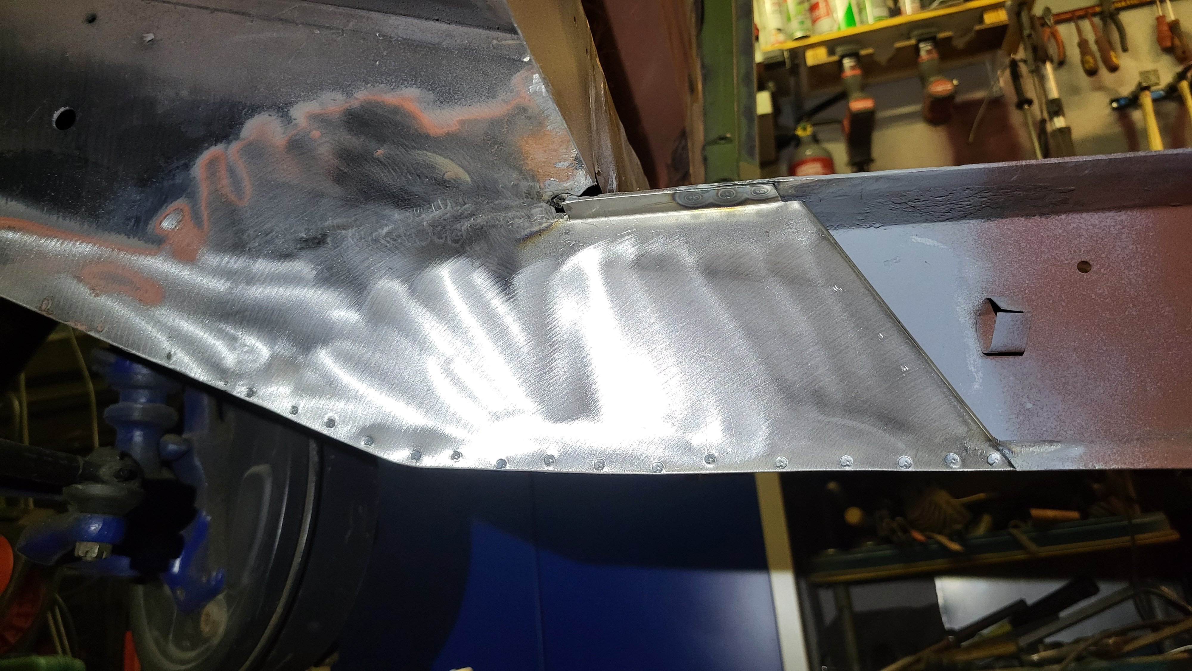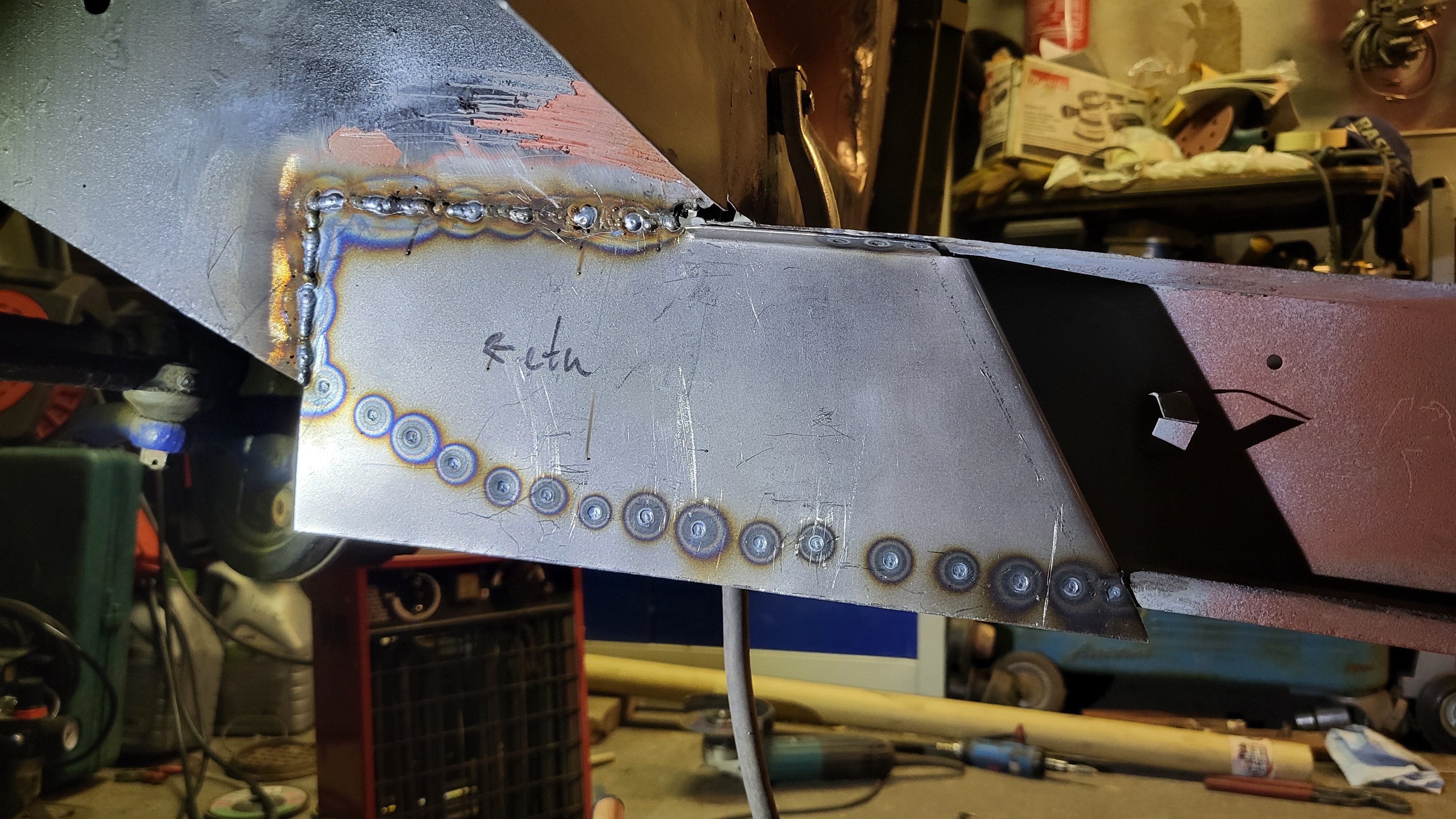 Kiitokset, kumpa olisi 20 vuotta sitten osannut tehdä samanlaista niin auto olisi varmaan jo valmis. Mutta itseoppien tähän sitä loppupeleissä päätyy. Tietty hitsauskoneella on ihan hiton iso merkitys tekemisessä. Paskalla koneella ei saa aikaan muuta kuin vihan auton hitsausta kohtaan. Tai vaihtoehtoisesti paskan koneen kanssa tarvitse vielä enemmän ammattitaitoa. Tietty oikeiden työtapojen oppiminen on myös myös pitkä tie esim. lamellilaikka on yksi näistä. Nykyään en juurikaan koske lamellilla hitsaussaumaan kun ennen se oli ainut millä saumoja viimeistelin. Nykyään hion sauman matalaksi kivellä ja viimeistely nauhahiomakoneella. Lamellilla voisi myös viimeistellä mutta aika usein on edessä tilanne kun ei vain mahdu hiomaan oineassa kulmassa. Sitten on noin millin raon jättäminen hitsattavien peltien väliin. Näin tehdessä peltiin menevän lämmön saa pidettyä pienempänä kuin päittäin olevien peltien kanssa. Samalla myös kokemattomampikin saa varmistuksen että pellit on läpiasti hitsattu.