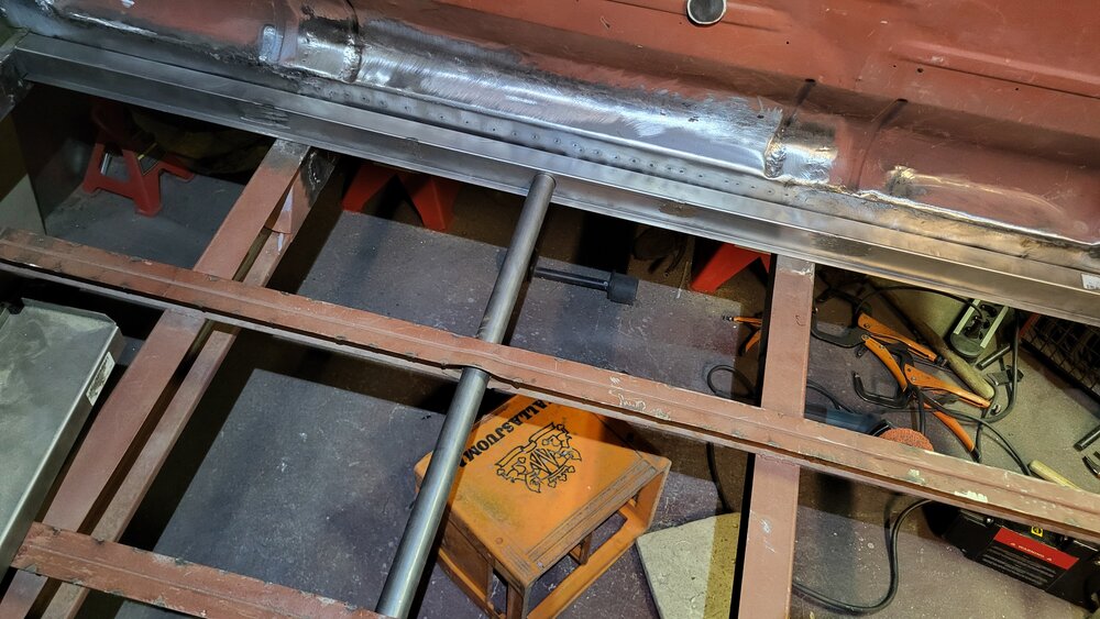 Paikkasin noi pikkureijät perän puolelta etummaisesta top hatista. Etummaiset tulee vasten tuota väliseinää niin ennen kuin laitan alapalkin kiinni niin lyön saumamassin sinne väliin niin välttää edes vähän hitsaamista. Seuraavaksi pitää varmaan sovittaa vaihdetangon suojaputki paikalleen että saa varmistuksen että keskireikä on linjassa ennen kiinni polttoa.